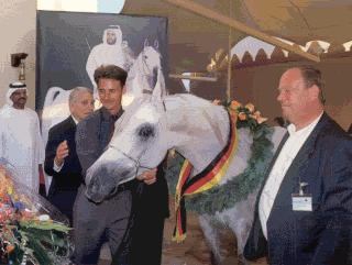 Höhepunkt war die Hengstparade, angeführt von dem in Australien geborenen Rapphengst Simeon Sadik, dem Eine‑Million‑Dollar‑Hengst, der jetzt in England bei Shirley und Charly Watts, dem Drummer der Rolling Stones steht. Aaahhs und Ooohhs raunten durch die Zuschauerränge, als der 11 ‑jährige Glanzrappe von seinem eleganten Vorführer präsentiert wurde. Der aus Schimmeleltem entstandene Zufallsrappe ist von Asfour aus der Simeon Safanad, 1996 wurde Sadik in Paris Welt-Reserve‑Champion. In Hannover drehte er nur seine Ehrenrunden während der Hengstparade und trat nicht im Schauwettbewerb an. Während der drei Tage wurden die Besten der Besten immer wieder miteinander verglichen und zum Schluss wurden die beste Stute der Schau und der beste Hengst der Schau zur Expo gefahren, um im Pavillon der Vereinigten Arabischen Emirate noch einmal gegeneinander anzutreten. |
